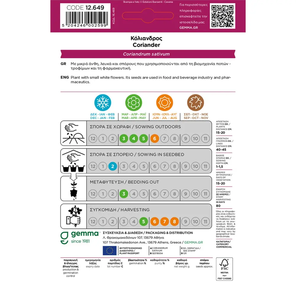 Οι σπόροι κολίανδρου της Gemma επιλέγονται για την υψηλή τους καθαρότητα και τη σταθερή τους απόδοση. Με τη σωστή φροντίδα, ένας φάκελος σπόρων μπορεί να σας παρέχει φρέσκο κολίανδρο για όλη την οικογένεια, εξοικονομώντας σας χρήματα και προσφέροντάς σας τη χαρά της δικής σας παραγωγής.